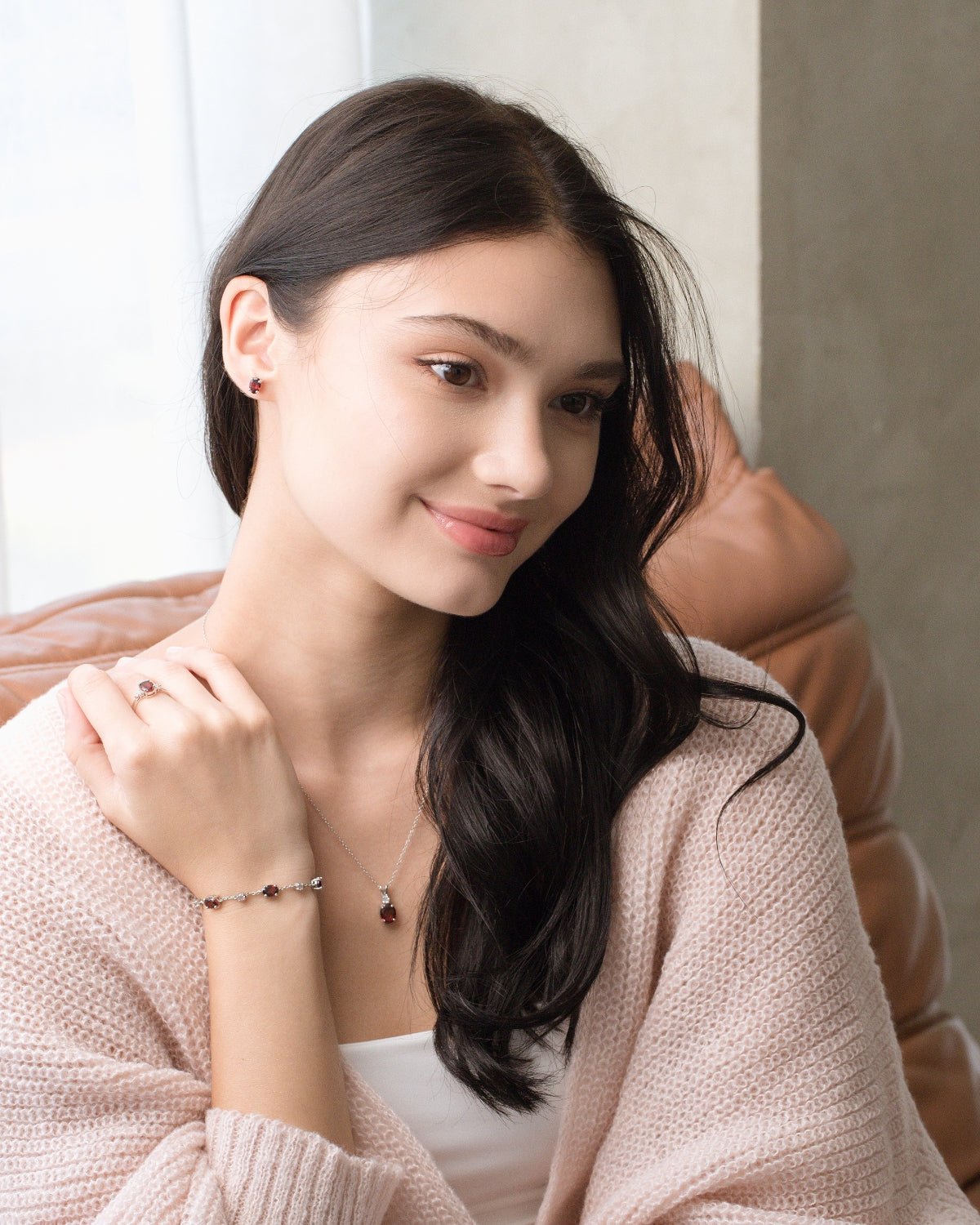 The ultimate gift set for red gemstone lovers, this jewellery set comprises a pendant necklace, a ring, a bracelet and a pair of stud earrings. Each piece has been meticulously handcrafted with garnet - the deep red gemstone. The necklace, ring and bracelet are also adorned with sparkly simulated diamonds. This jewellery set will make the perfect Christmas gift, birthday gift and anniversary gift for your loved ones.
