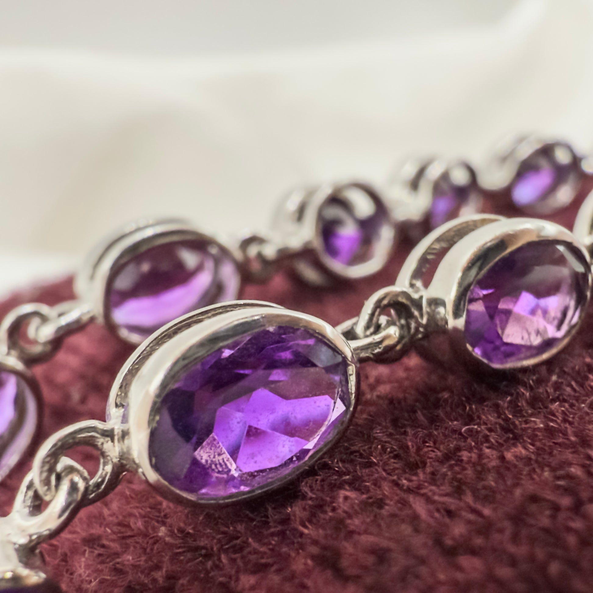 Elegant, timeless, and bursting with rich colour – this vintage 9ct white gold bracelet is set with 16 stunning oval-cut amethyst stones. A classic piece that balances sophistication with a vibrant splash of purple, it’s perfect for everyday elegance or special occasions.
